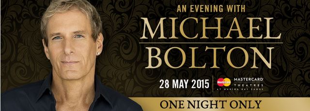 SINGAPORE (17 December 2014) – Grammy legend Michael Bolton brings a hit filled set list of soulful classics, power ballads and beautiful arias to the MasterCard Theatres at Marina Bay Sands on Thursday, 28 May 2015 for one night only. MasterCard Holders will receive a 15% discount on A & B res tickets from the 17 to 24 December. Tickets are now on sale.